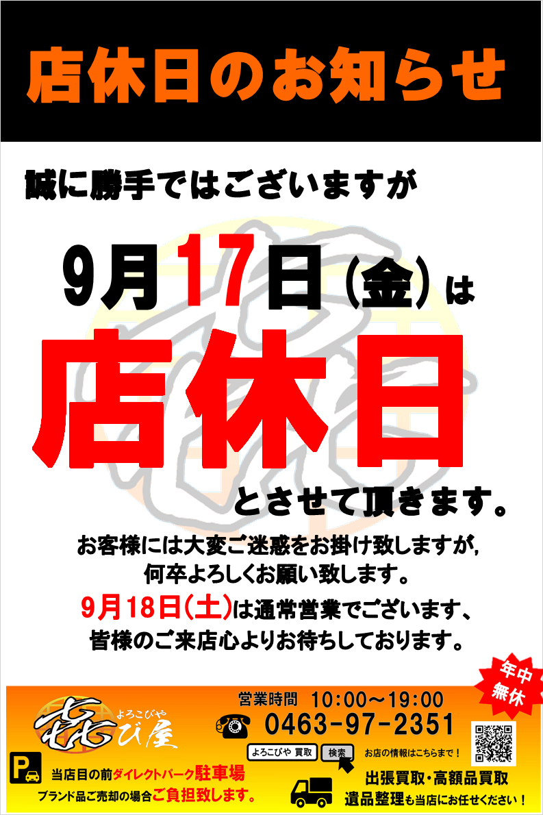 査定無料、地域1番の高価買取を目指し、年中無休で営業しております。